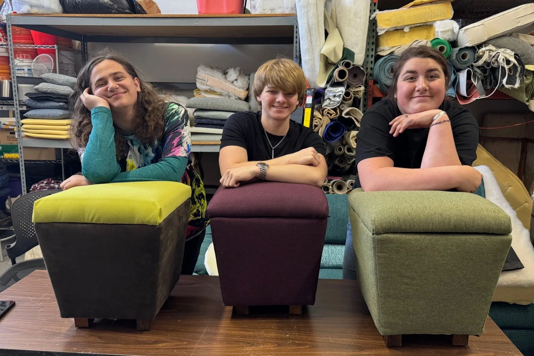 Sol, Cole, and DjiNia display their refurbished ottomans